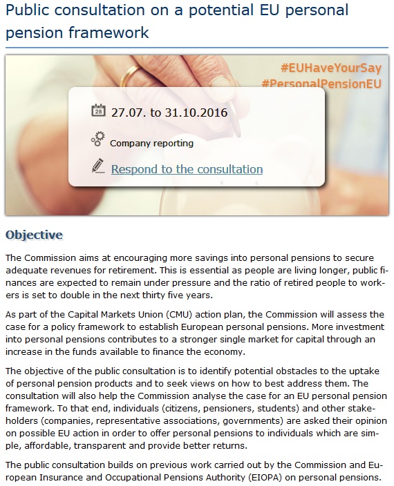 Do 2060. godine demografske promjene u EU-u prepolovit će broj radnika koji financiraju umirovljenike. Zbog toga će europski mirovinski sustavi biti suočeni s dvostrukim izazovom: zadržati financijsku stabilnost i nastaviti nuditi adekvatan prihod umirovljenicima. Zahvaljujući savjetovanju, Komisija će lakše procijeniti što se može napraviti na razini EU-a kako bi se ponudio širi izbor osobnih mirovina i omogućila prekogranična konkurencija. Budući da je riječ o jednom od ključnih čimbenika na tržištima kapitala, jačanje ulaganja u osobne mirovine jedan je od prioriteta unije tržišta kapitala. Time bi se omogućio veći priljev ušteđenih sredstava na tržišta kapitala i usmjeravanje dodatnih financijskih sredstava u produktivna ulaganja.